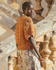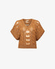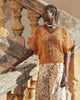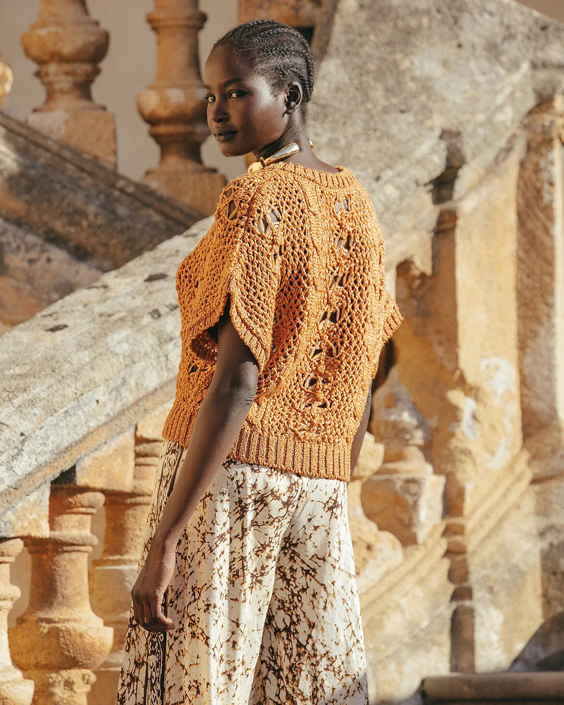 Small delicate sweater with openwork and twisted weave in ocher color. The cut is short with small dropped sleeves.