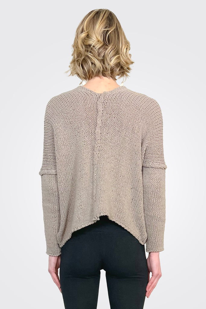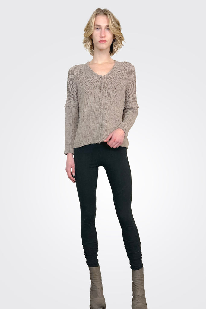 – raw knit– slouchy style– oversized– V-neck– external seams– 80% recycled cotton 15% cotton 5% other fibers