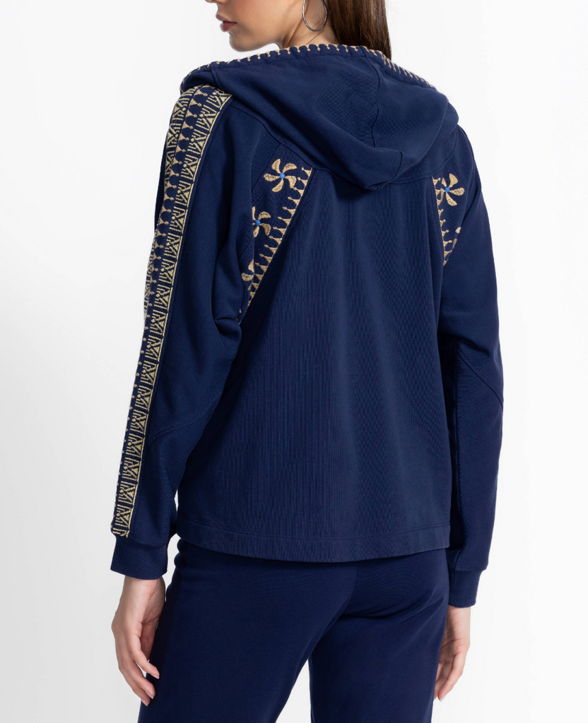 Crafted from 100% cozy cotton, the Akari Dolman Seamed sweatshirt is embellished with beautiful intricate seaming. Designed with a hooded zip-front closure Raglan sleeves, this unique hoodie is adorned with bold floral embroidery in a kaleidoscope of brilliant color. Pair with the Akari Baby Boot Leggings and fashion sneakers for a perfectly coordinated look.