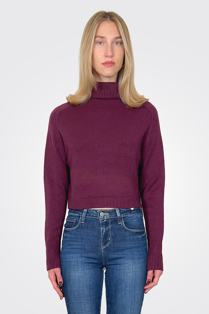 Viscose blend turtleneck sweater with long raglan sleeves. Crop length