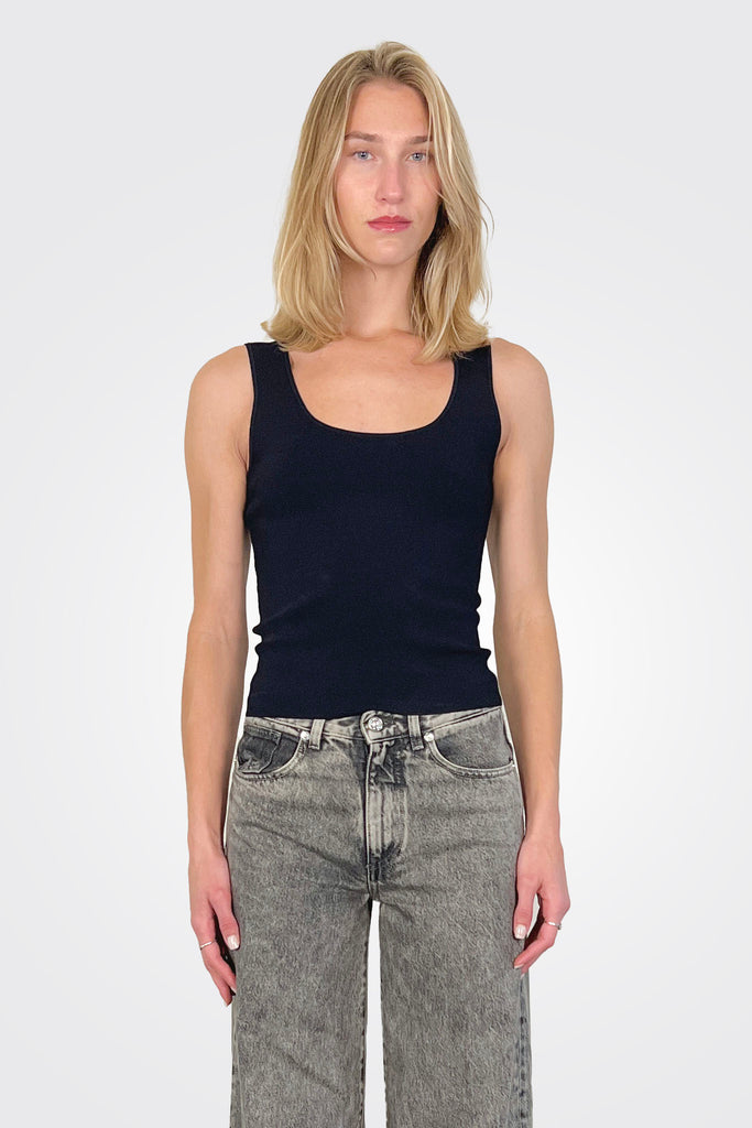 The perfect tank: framed by a scooped neck and back, our smooth Italian stretch-blend top hugs the form to seamlessly slip beneath waistbands for elegant layering.