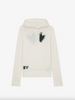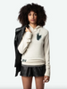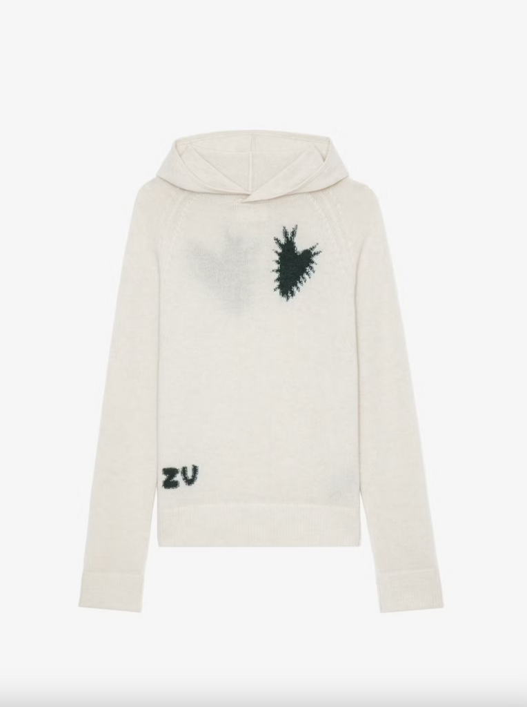 Ecru cashmere hooded sweater with intarsia motifs and metallic heart embroidery, "Hello Stop Breaking Hearts" message and ZV signature.