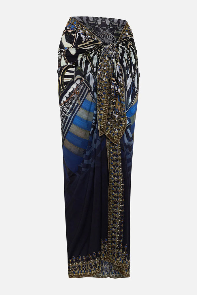 Resort wear meets wild majesties, the Knights Of The Wild Long Sarong is wrapped in a monochromatic zebra print dipped in metallic chain details, striking portraits and pops of royal blue hues. Sporting a multi-wear design, this luxury sarong wrap features a generous length, tie-up fastening and a contrast panel trim.