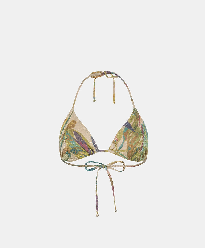 Carry-over triangle top in stretch lurex jersey printed with exclusive Momonì designs. Lined, with gold colour narrow ties.