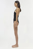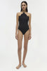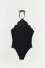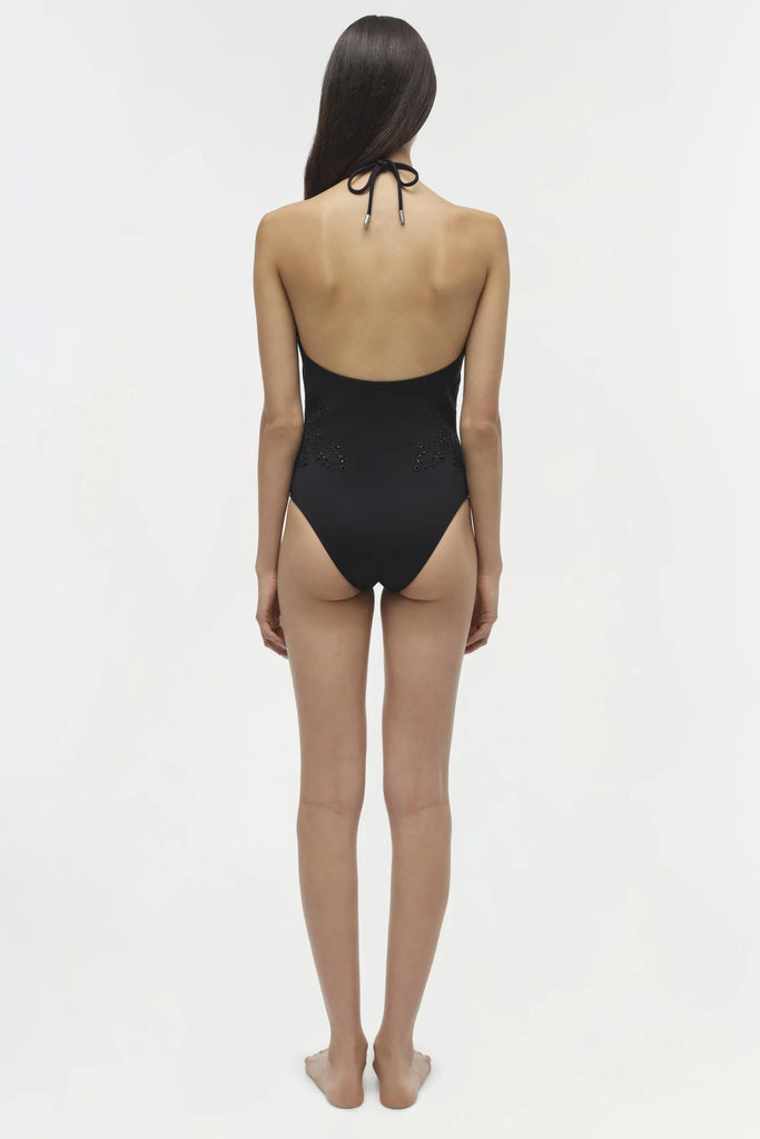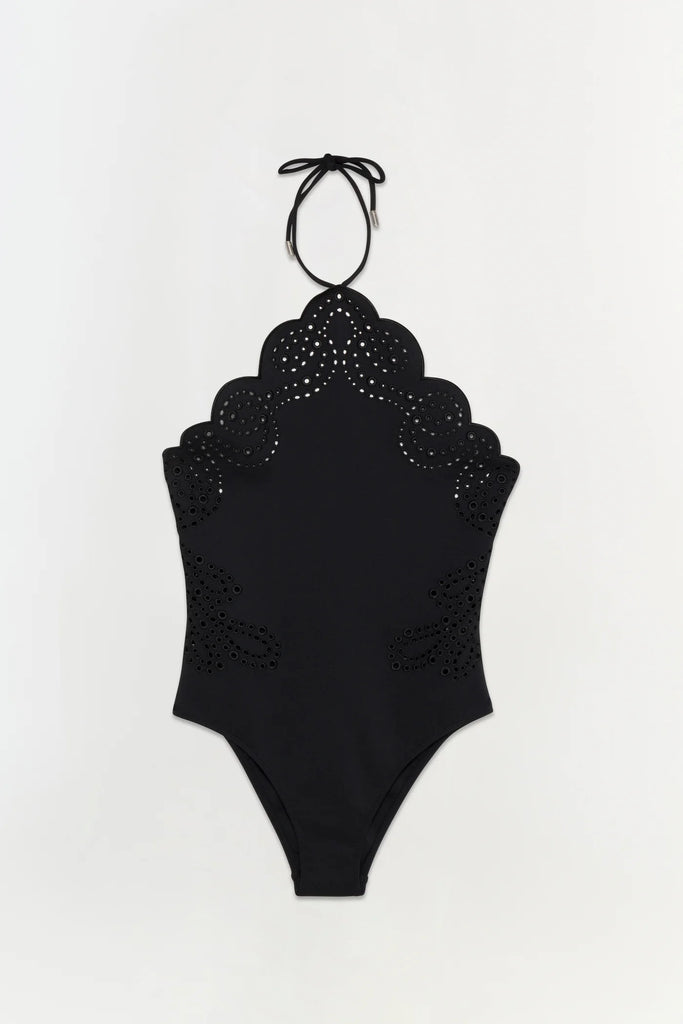 The Nicolette Halter Embroidered Swimsuit in Black. Showcasing intricate broderie anglaise detailing, this one-piece swimsuit blends functionality with timeless elegance.