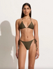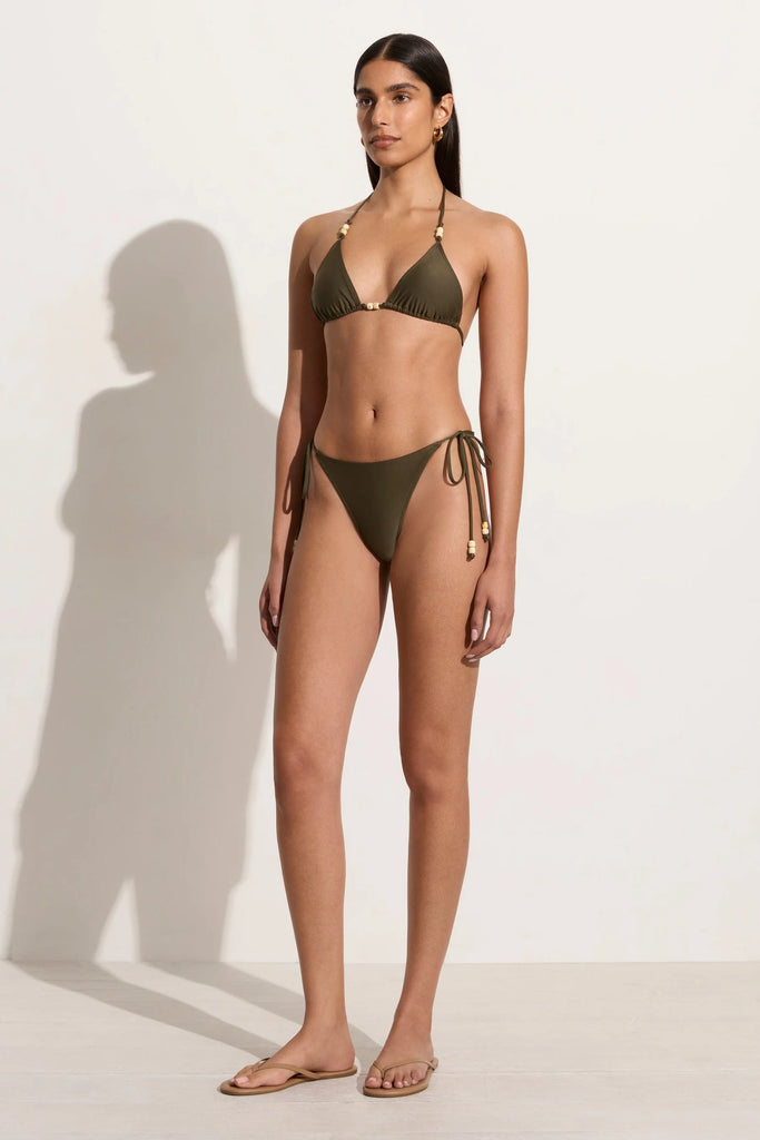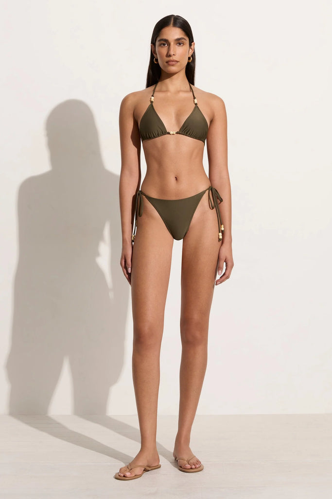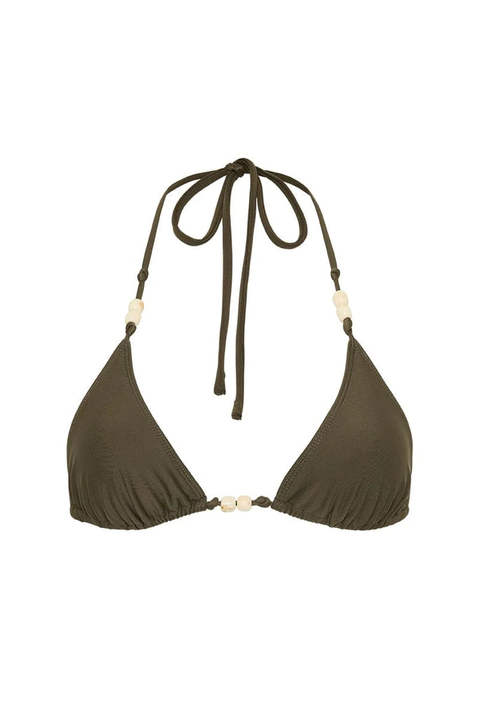 The Uma in Khaki is a triangle bikini top with halter tie straps and contrast bead details at the centre front and ties. Crafted from recycled nylon and custom dyed in a tonal khaki hue for a timeless finish. Pair it with the Ada Bikini Bottoms for a staple swim set, ready for any sun-soaked and poolside occasion.