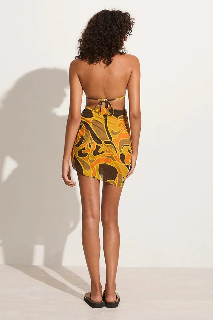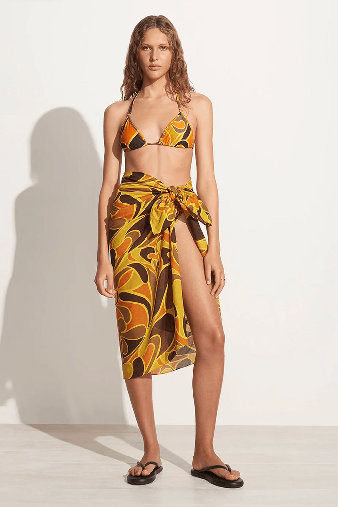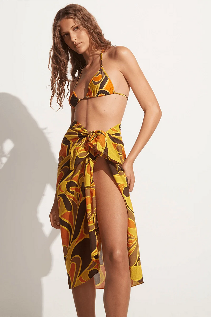 Lightweight cotton voile is artisinally hand-dyed in a statement abstract print to form the Zinnia Pareo. Designed for multi-wear, this pareo can be worn on the hips or tied across the bust as a strapless cover up over swim. This style pairs back effortlessly with our plain bikinis for elevated beach styling.