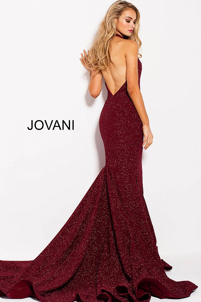 Details: Plunging halter neckline with deep v and mesh insert, low open back, fitted silhouette with a long train.