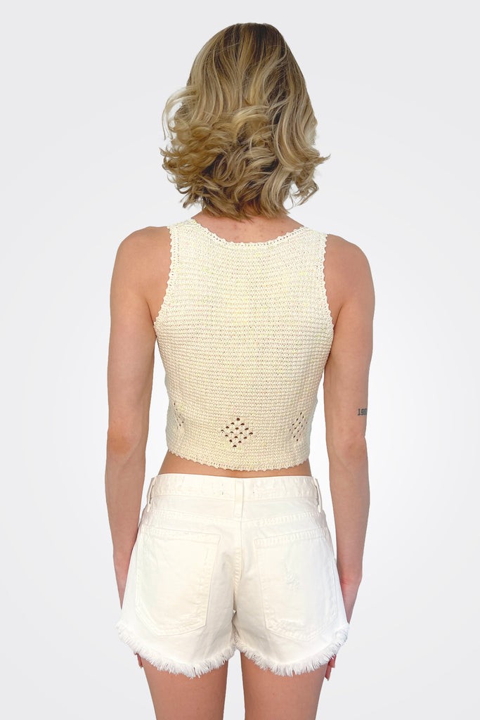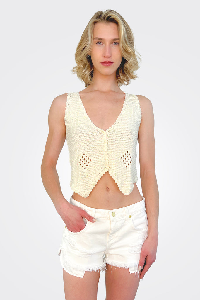 We love the details of this cotton knit vest by Autumn Cashmere... from the diamond crochet details to the little flecks of colour in the yarn. Looks fabulous paired over a tee or tank.. or simply on its own. Wear with skirts, jeans, shorts, or whatever you please.