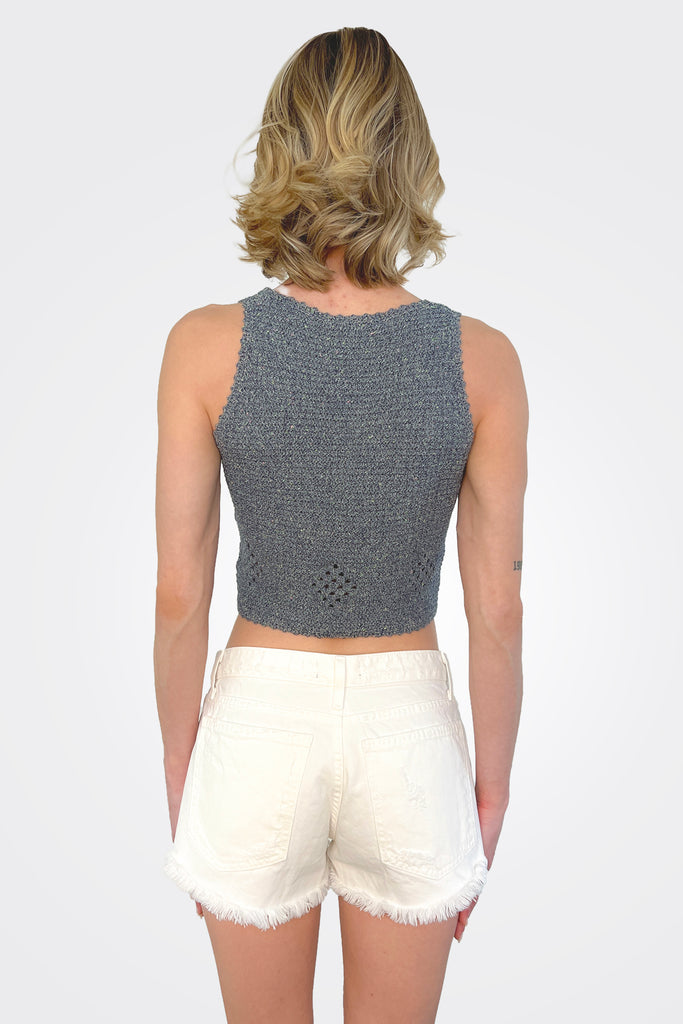 We love the details of this cotton knit vest by Autumn Cashmere... from the diamond crochet details to the little flecks of colour in the yarn. Looks fabulous paired over a tee or tank.. or simply on its own. Wear with skirts, jeans, shorts, or whatever you please.
