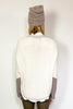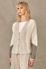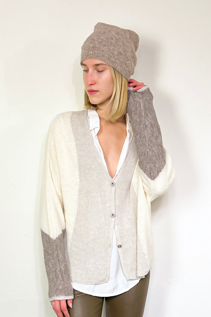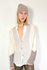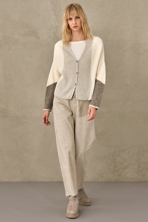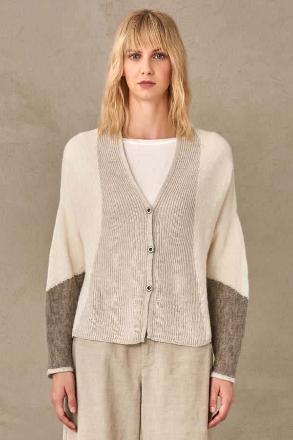 Oversized jacket in wool blend alpaca. V neckline closed by three metal buttons. Play of yarns and workmanship to create a contrasting motif on the front and on the sleeve.