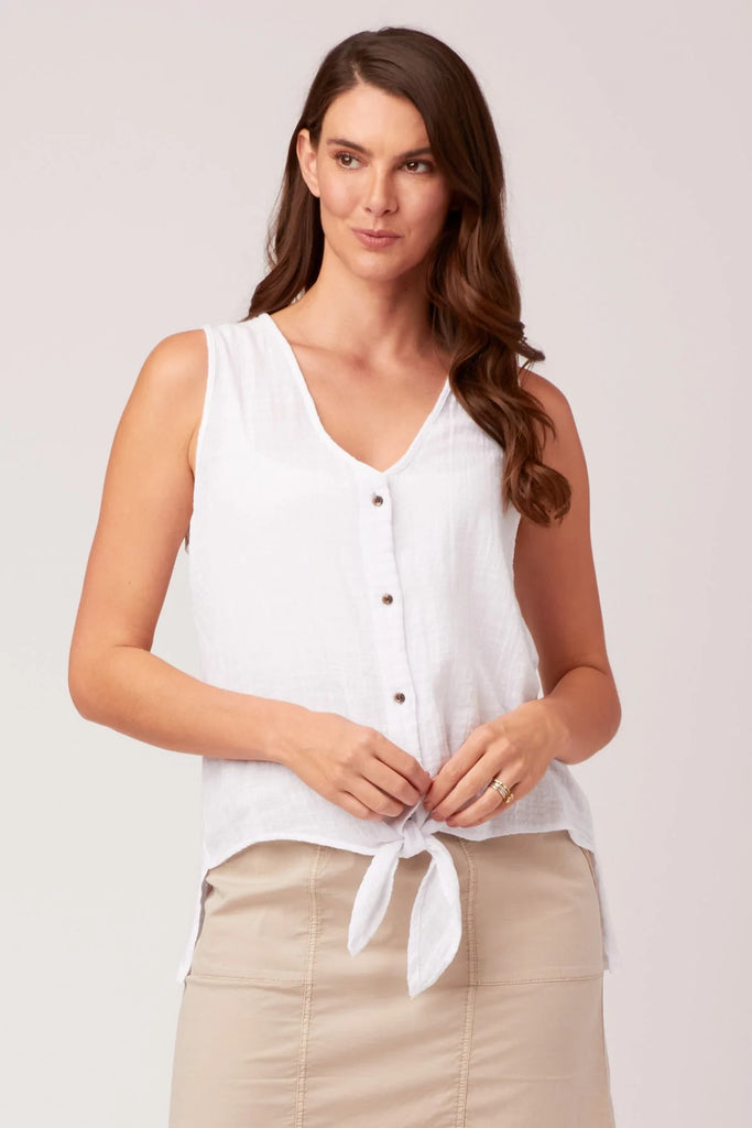 A cute sleeveless, bra-friendly top which features a button-down v-neckline with a front tie, a square high-low back hem.