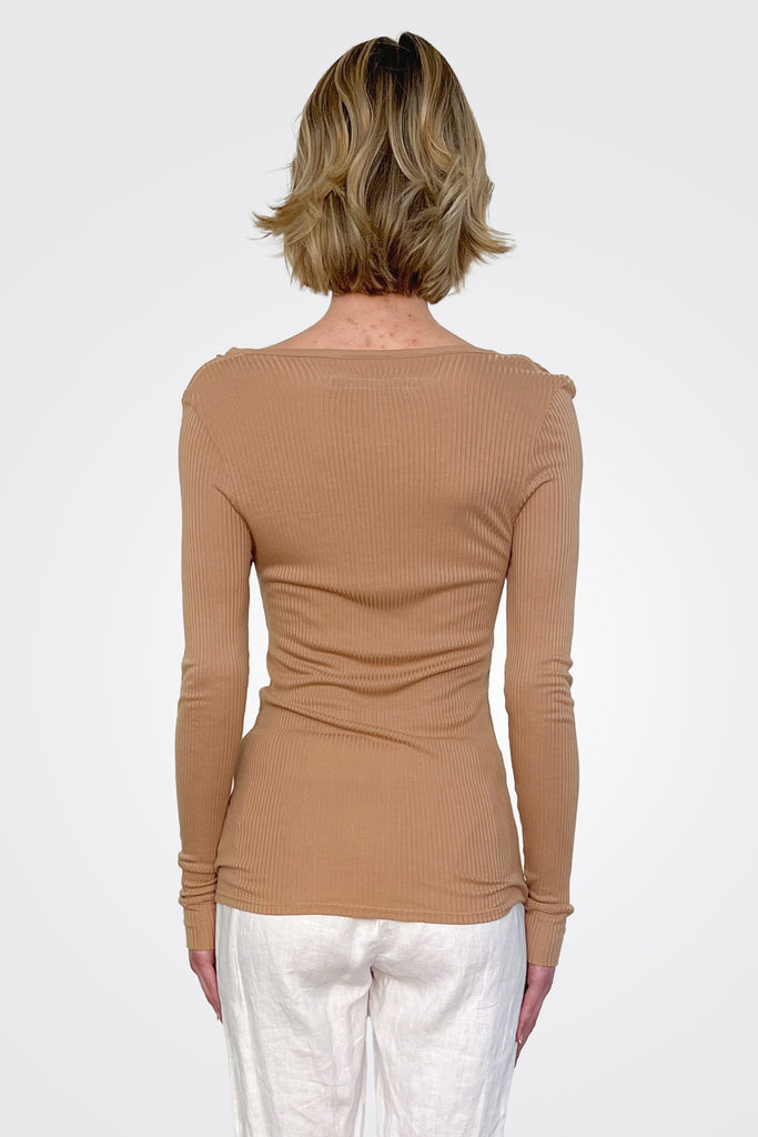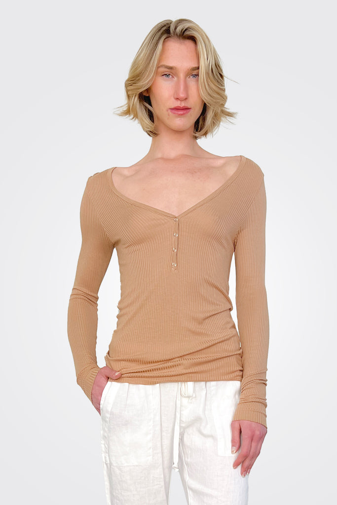 Rib knit with notes of silk, Enza Costa's henley top is a casual staple for your daywear wardrobe. Partial front button closure. Pull-over style.