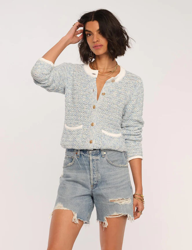 The Sol Cardi is made of our soft melange yarn and has a relaxed fit with contrast ribbed edges. It has gleaming novelty buttons along the bodice and pairs perfectly with your favorite cut-offs.