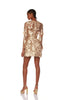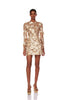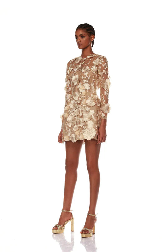 Embrace elegance in our Bouquet Maraya Gold Long Sleeve Mini Dress, boasting long sleeves and intricate flower appliqués throughout.