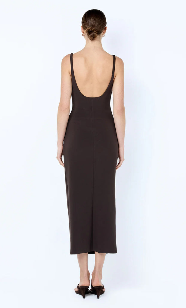 Karina Midi Dress in Espresso. This timeless brown midi dress is crafted from our signature bonded crepe fabric, creating a flattering, form-fitting dress perfect for any event.