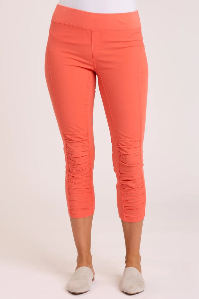 This classic and an all-time favorite legging features a pull-on elastic waistband, jersey side inserts at side leg for an impeccable fit, and rouching at leg bottom.