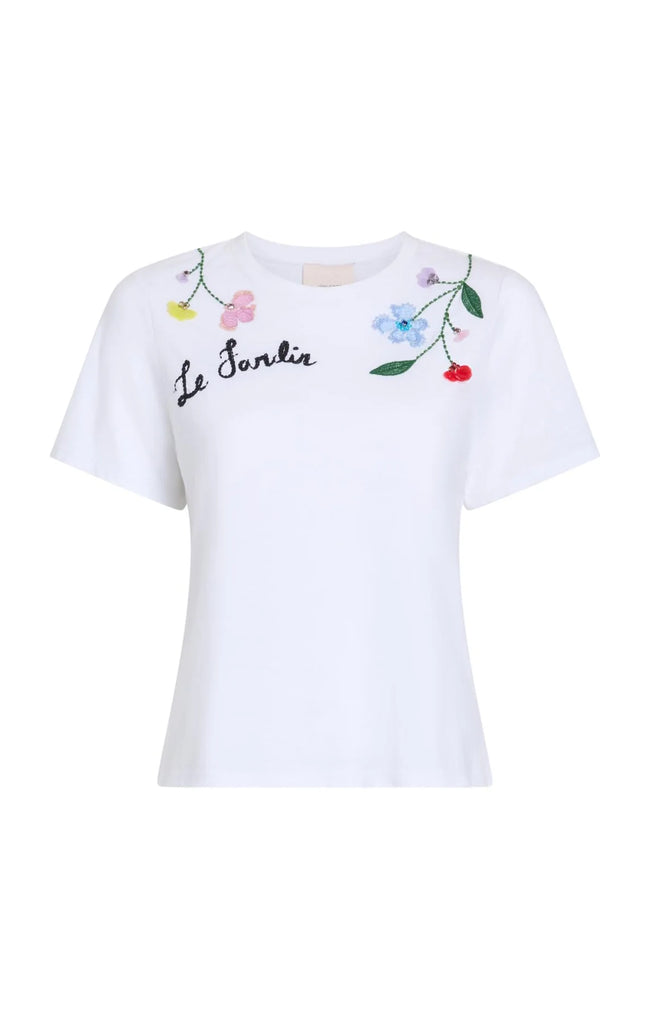 Experience casual luxury with this shrunken tee showcasing dimensional floral vines adorned with shimmering paillettes and intricate beading across the shoulders and neckline. The beautiful French "Le Jardin" inscription in flowing cursive completes this effortlessly chic piece, bringing forth understated sophistication.