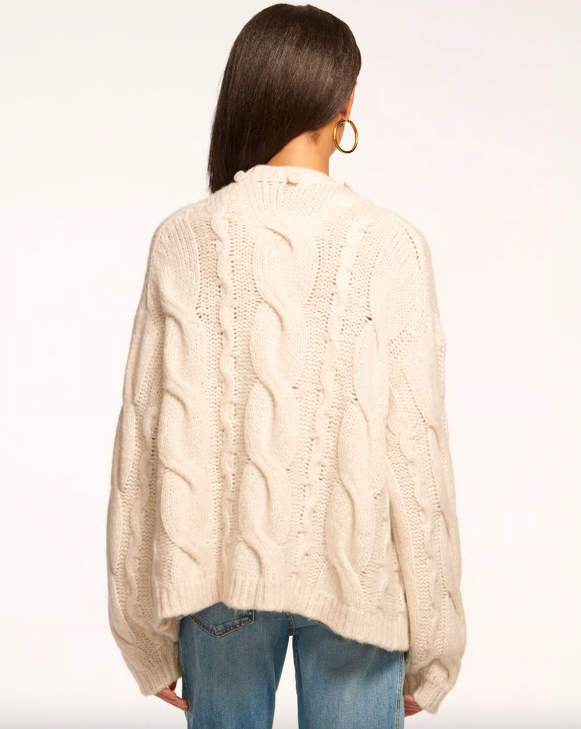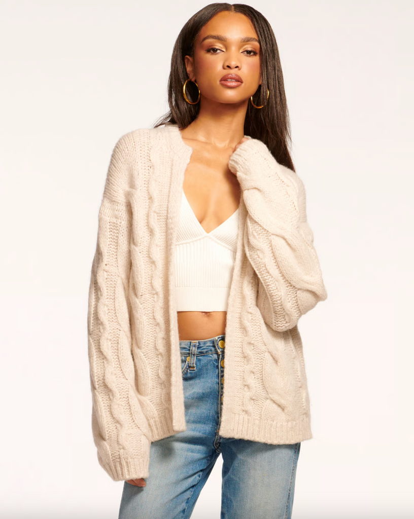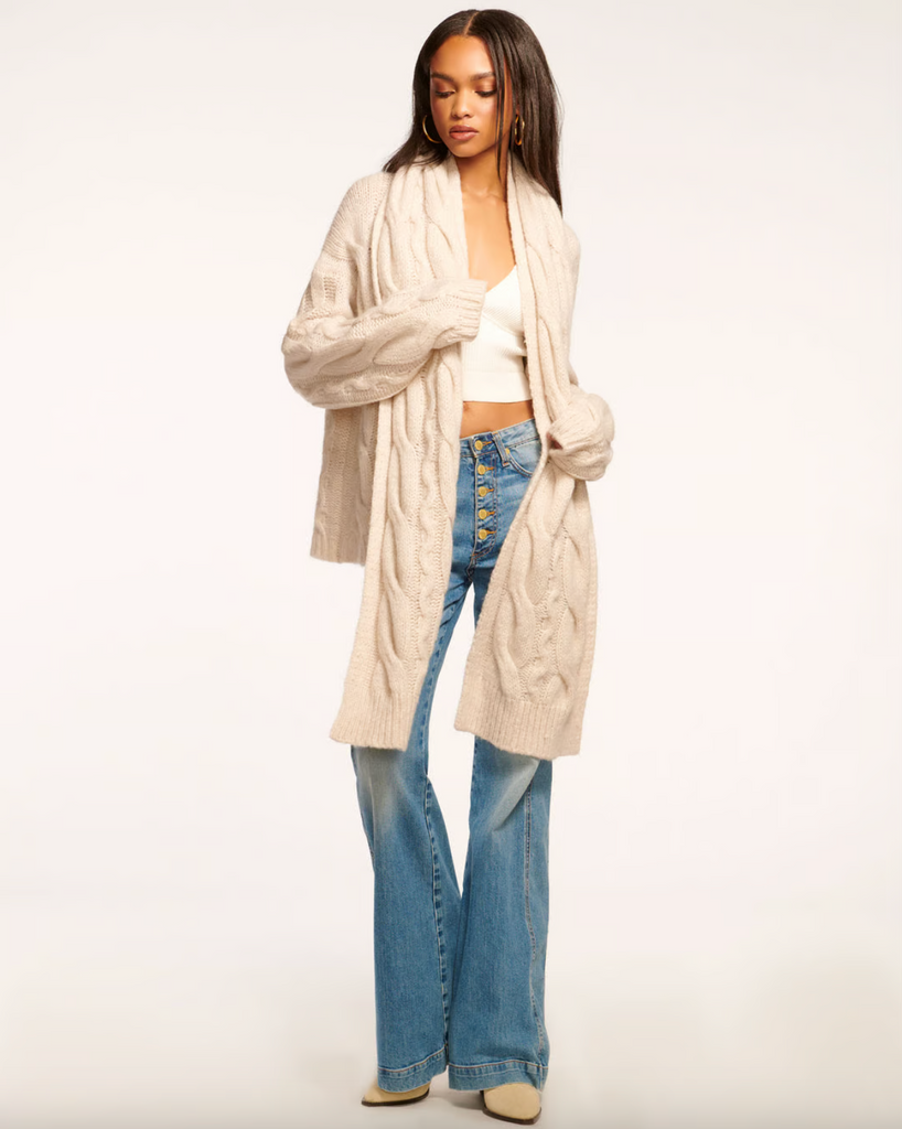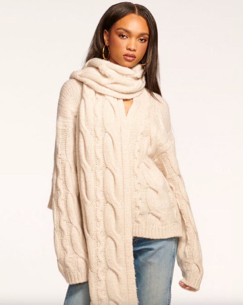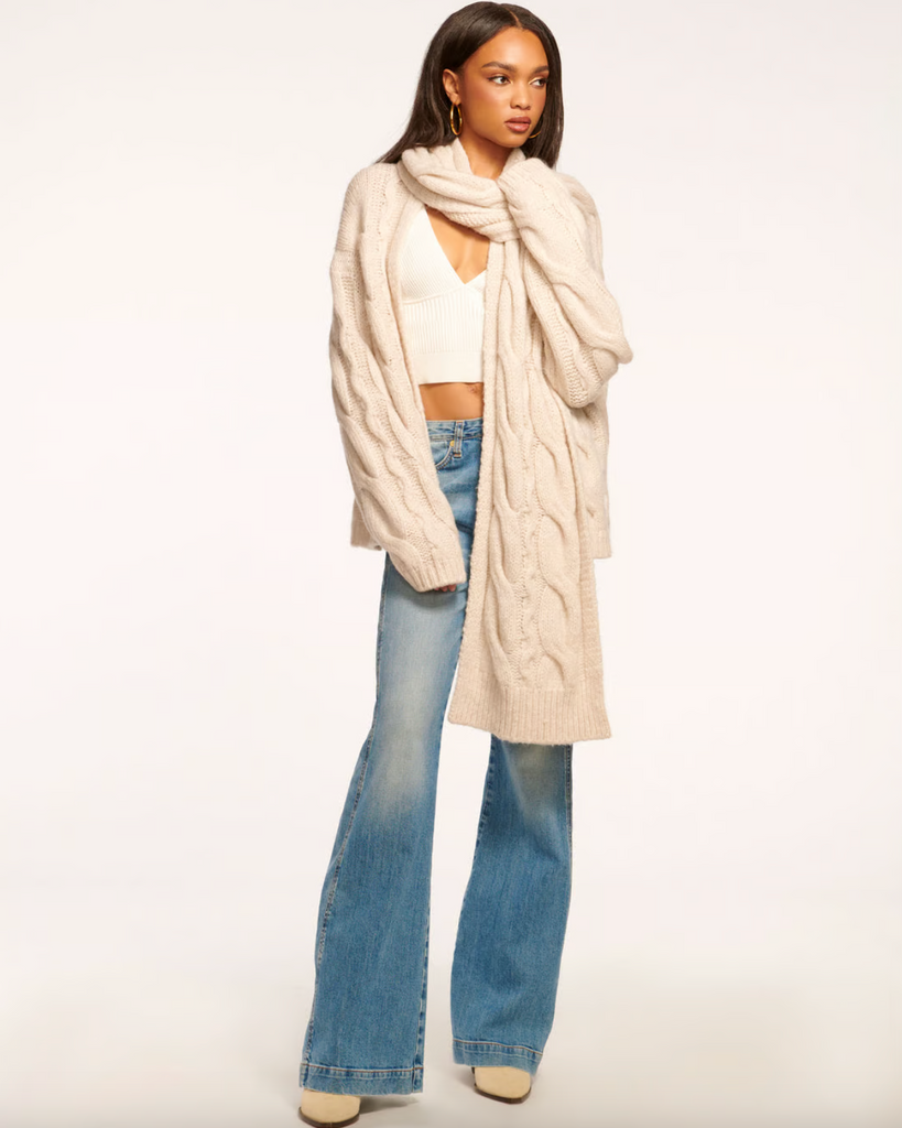 Wrap yourself up in the Agnes, a cable knit sweater with a matching removable scarf. This wool-blend cardigan is a must-have wardrobe essential for casual fall days. Layer over a pair of jeans and a casual top for a cute and comfy outfit.
