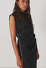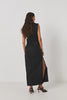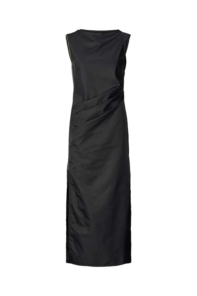 Crafted from a lightweight recycled fabric, the long nylon dress is defined by a most flattering, feminine silhouette highlighting the figure. The design stands out with a sleek zipper detail featured on the right side of the dress letting you play with the length of the slit for a more or less daring appeal. It has pleated waist details, straight shoulders, and a feminine boat neck.