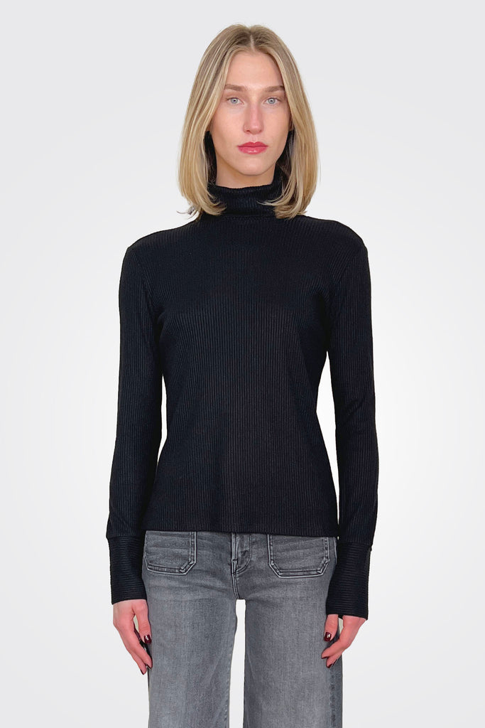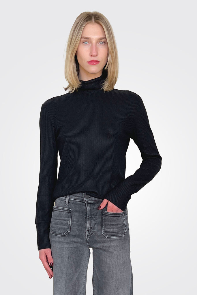 A stretchy ribbed knit contributes to the slim-but-not-snug fit of this turtleneck top that layers easily or stars just as well solo in your polished look.