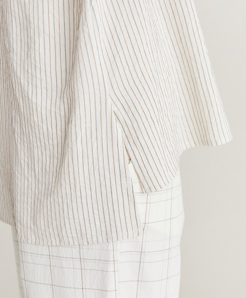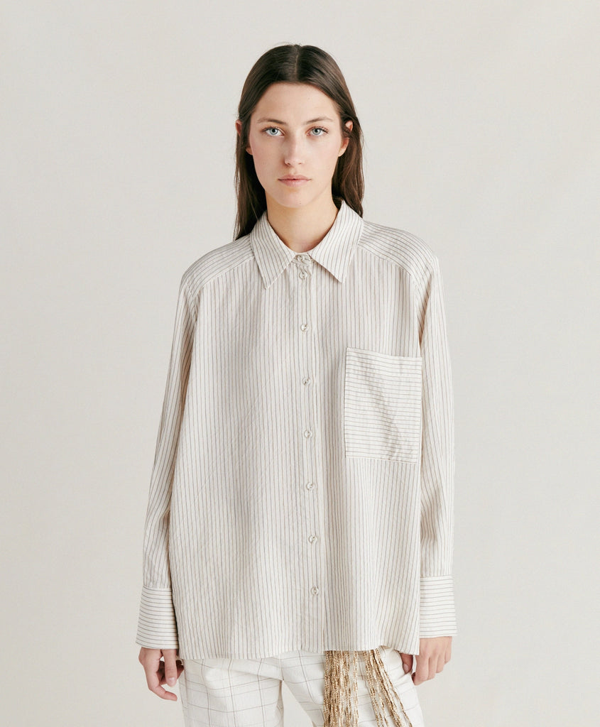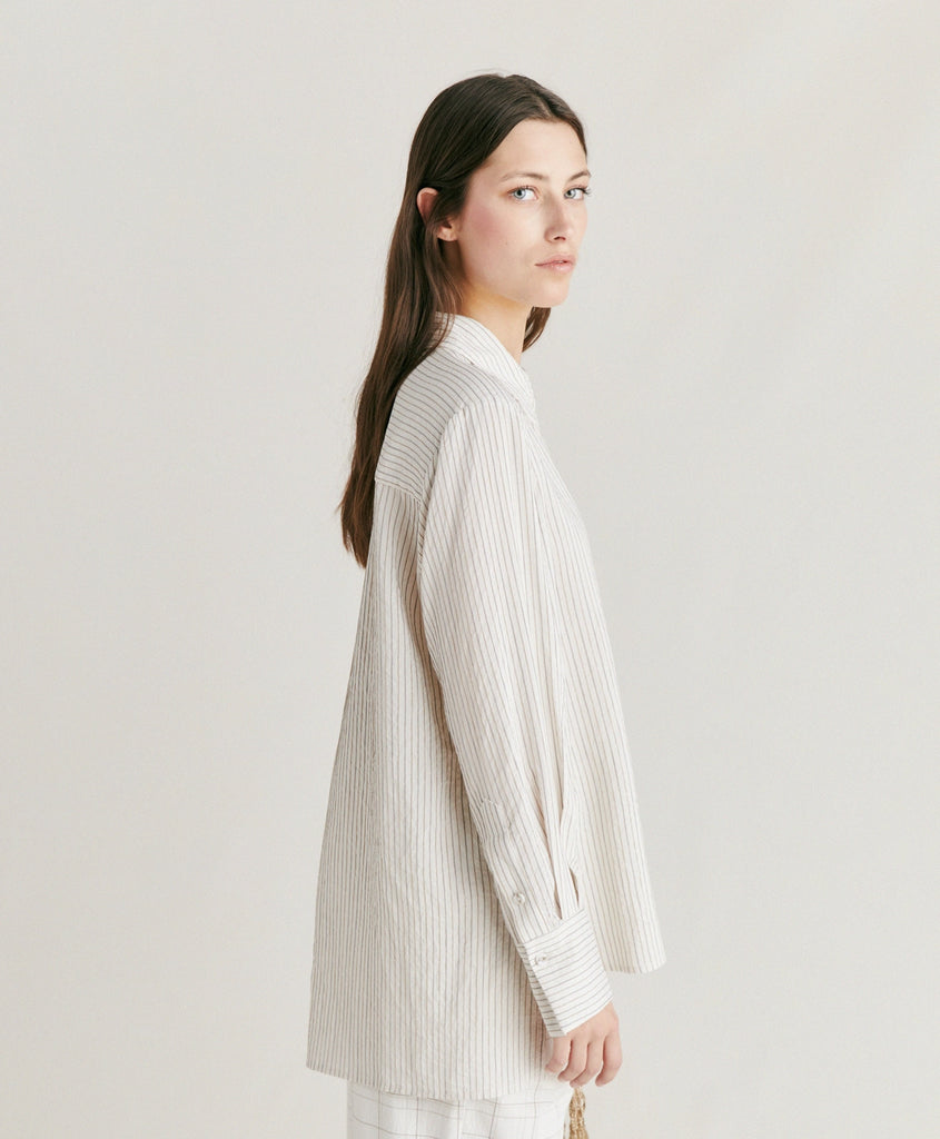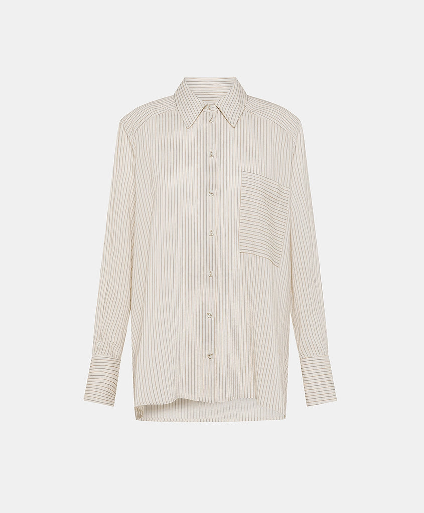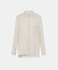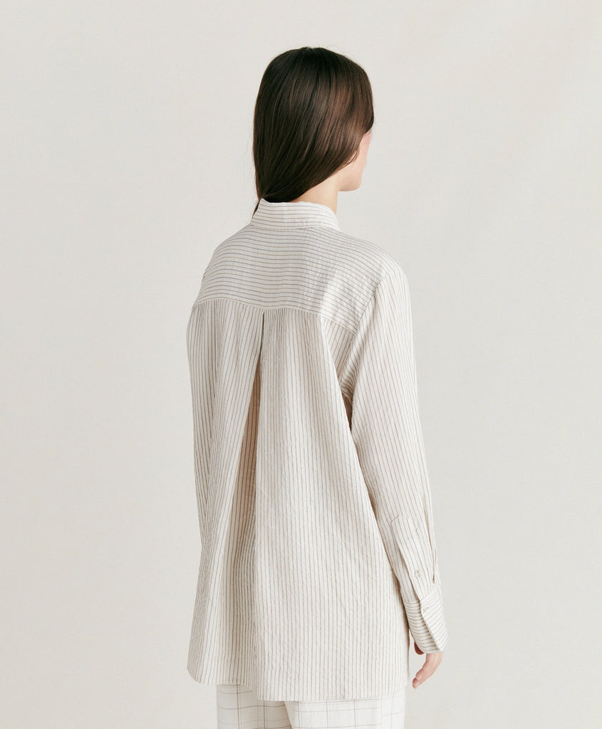 Oversize shirt with masculine inspiration in multi-striped viscose, silk and cotton. Stripes change direction on deep cuffs, pocket, shoulders and back yoke which also feaures a maxi inverted pleat.