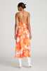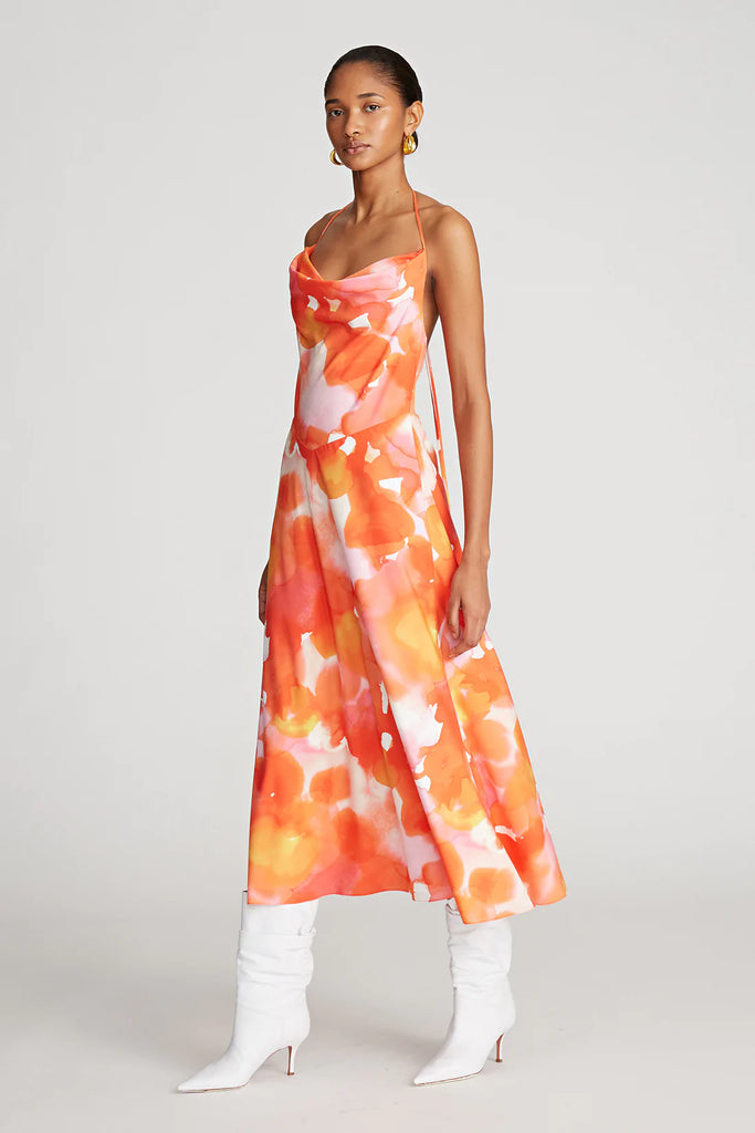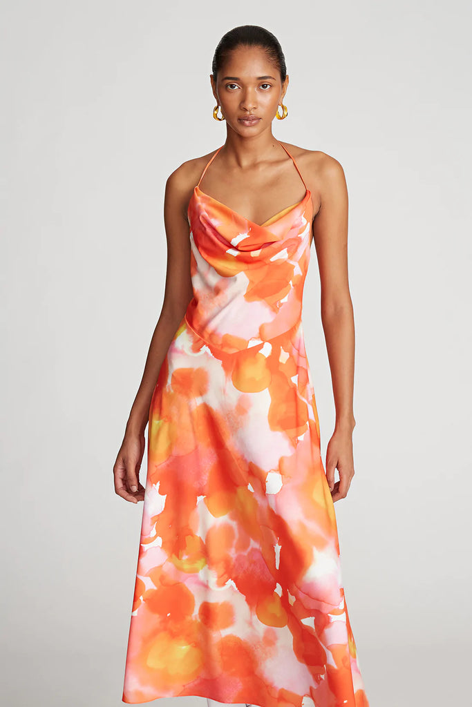 Crafted in our signature crepe de chine fabrics, the Marian dress features a silky-smooth texture with elegant drape. Framed by an alluring neckline, its canvas showcases our refreshing sunset watercolor palette—perfect for making a grand entrance.