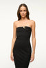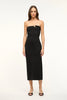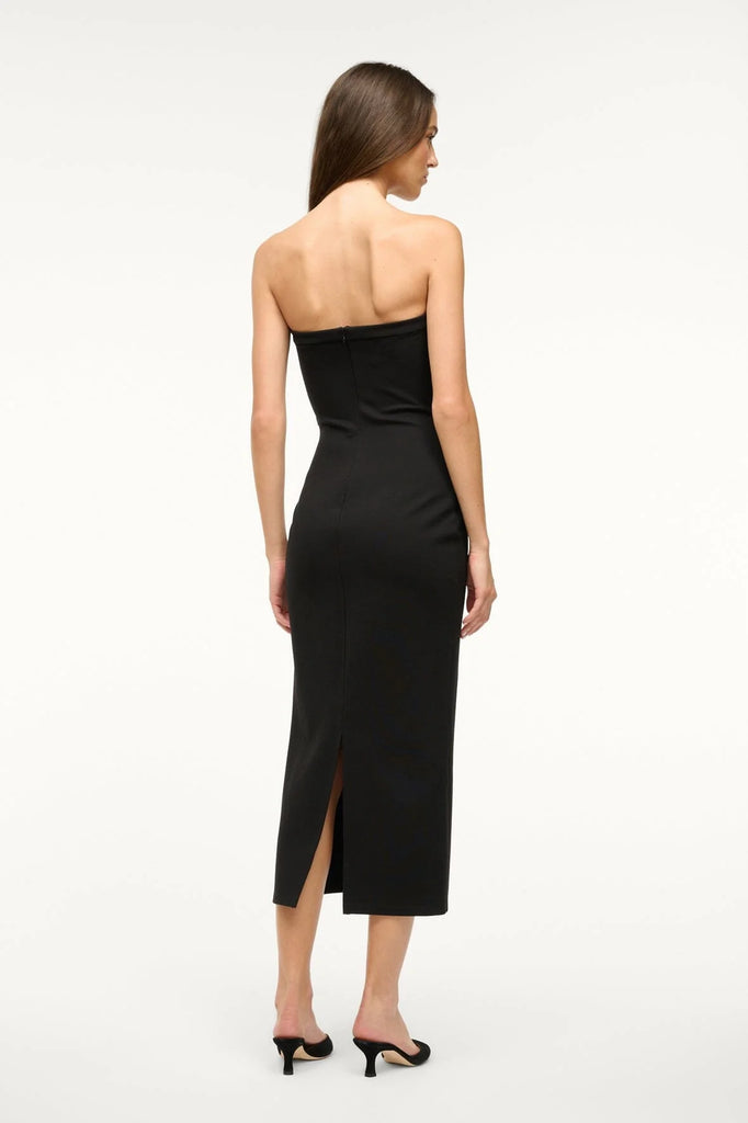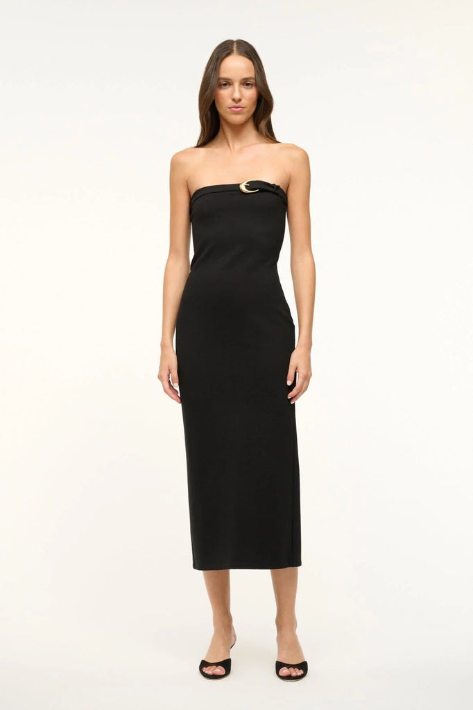 The Beekman is an ankle length strapless column dress with our signature moon buckle hardware at the neckline.