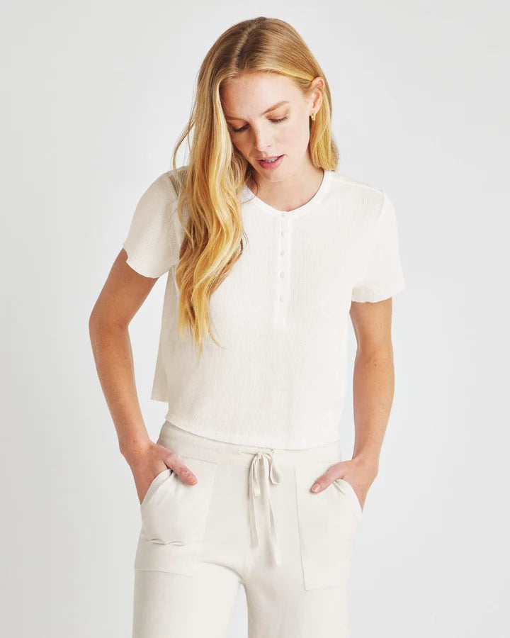 This cozy thermal is made in a T-shirt silhouette with short sleeves and a slightly boxy fit. The crewneck with button placket and waffle texture reflect its signature henley thermal design, while the raw edges give it a laidback finish.