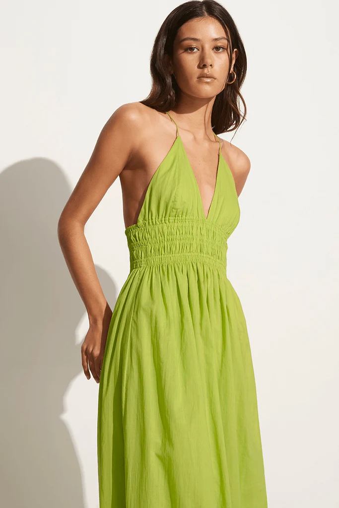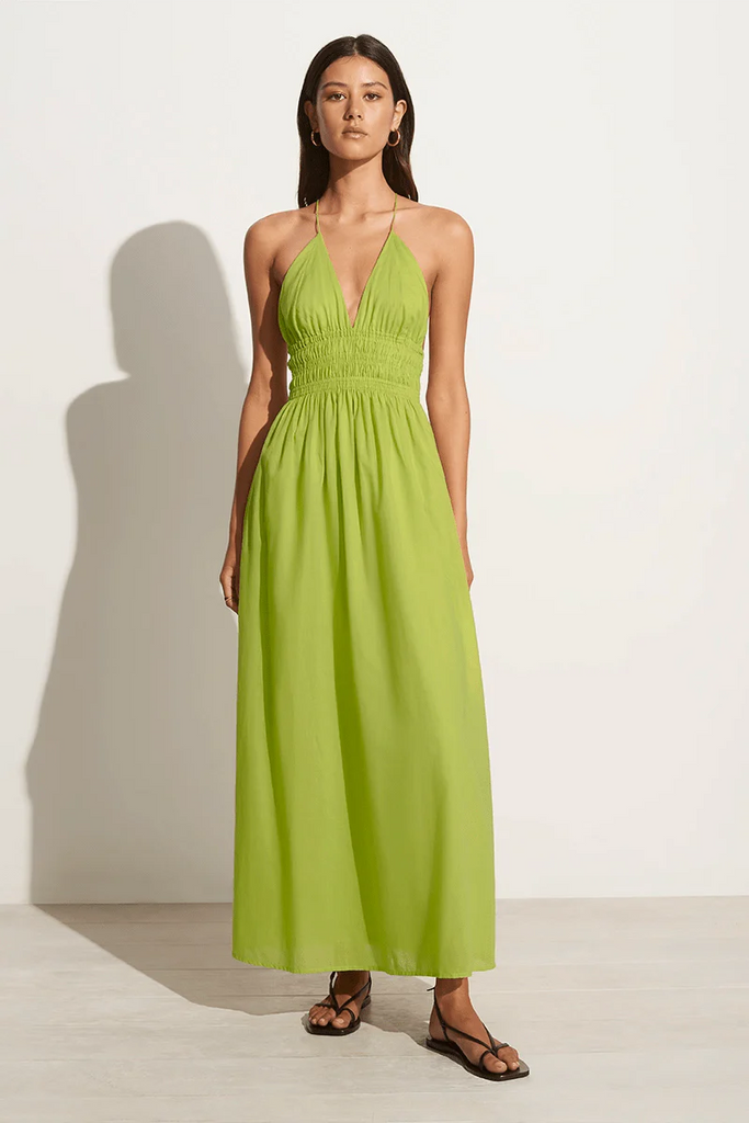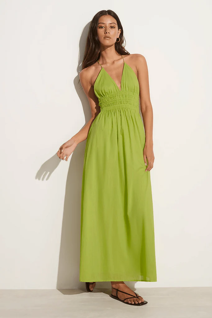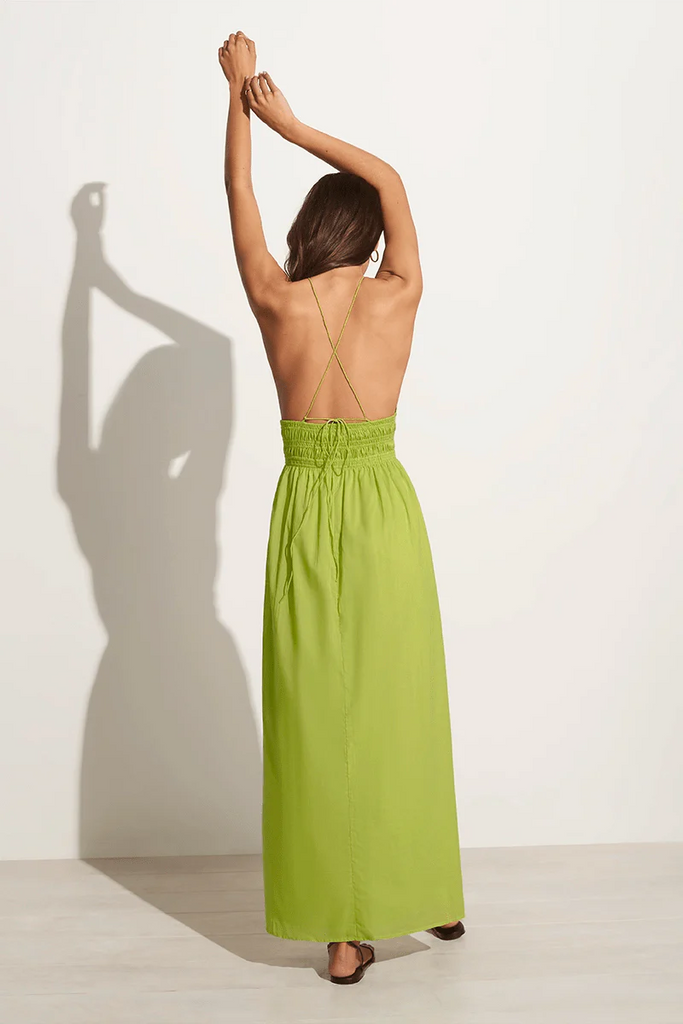 An occasion-ready silhouette lies in the Bisetta Maxi Dress. Cut from certified organic cotton voile hand-dyed in a statement Kiwifuit green hue, this maxi dress features a flattering triangular bust, thin cross back straps and a fitted waistband cascading down into a floating full length skirt. From relaxed long lunches to sundown soirees, arrive in style to all your occasions in the Bisetta.