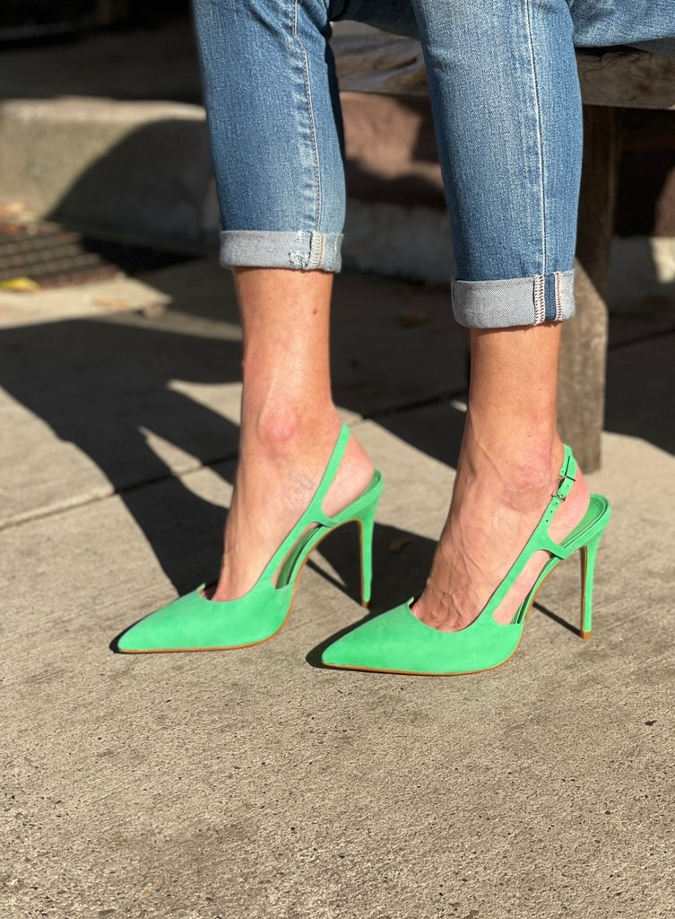A high-heeled, slingback pump with a delicate buckle closure at ankle. Crafted from nubuck and ready to take charge.Material: NubuckRubber heel patch at leather soleSling-back pumpPointed toeStiletto high-heelHeel Height: 4 in | 100 mm