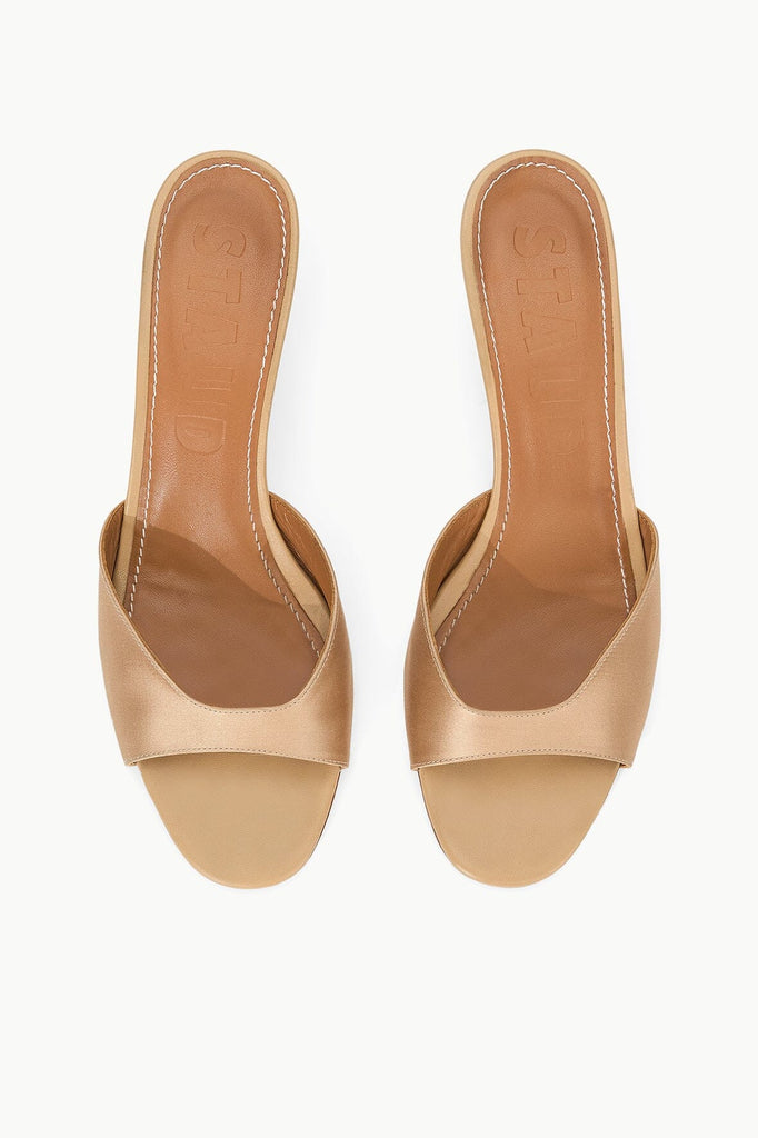 An open-toe mule crafted in satin, the Brigitte is an essential kitten heel for versatile dressing.