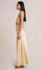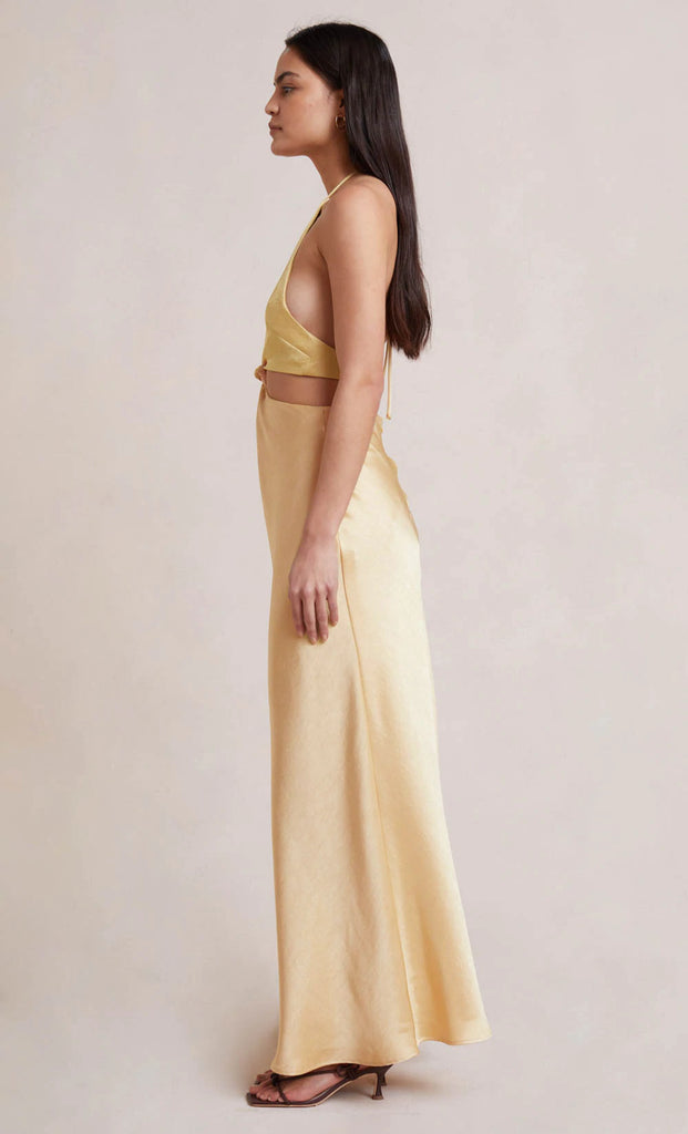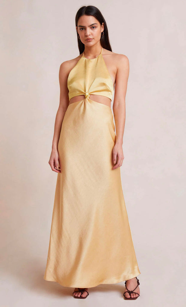The Carrie Halter Dress is an effortless statement style cut from a fluid satin fabric. The dress features a self-tie halter neck in a flattering bias silhouette with a knotted twist front and underbust cutouts.