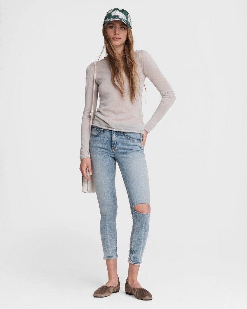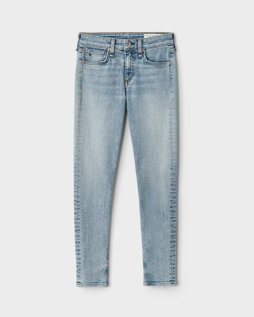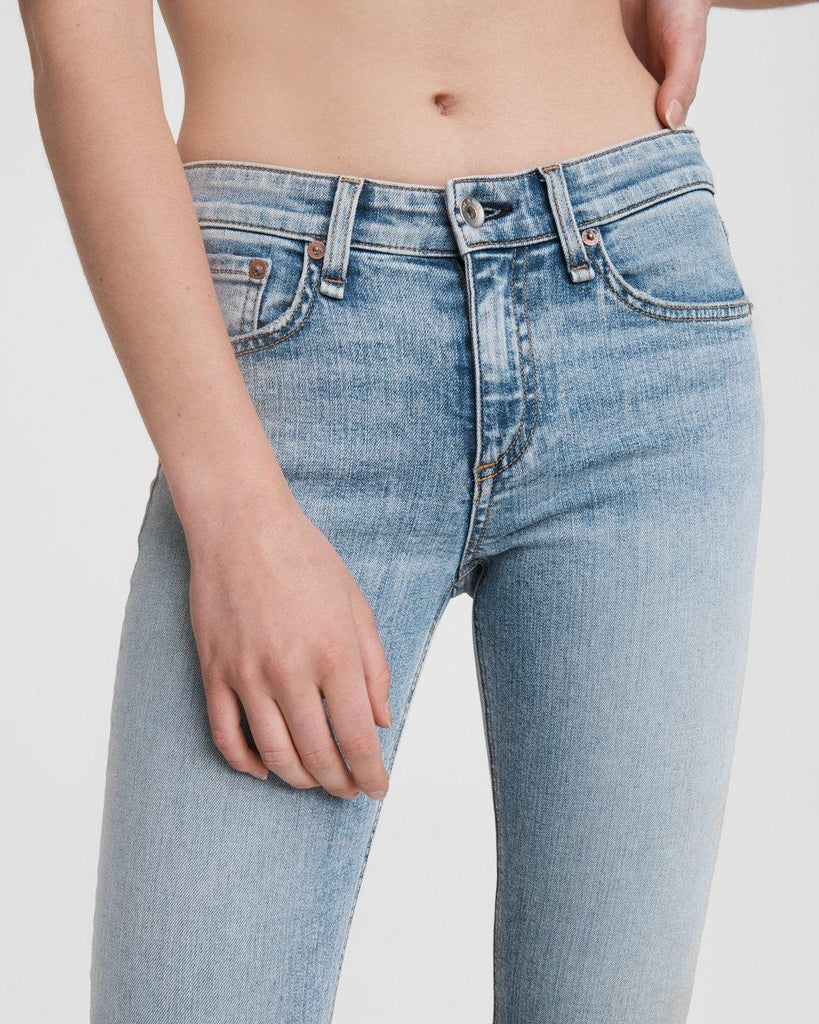 Stella is a light acid washed Japanese stretch denim cut in rag & bone's iconic Cate: our perfected mid-rise silhouette. Sitting at the natural waist, Cate is slim through the hip and thigh with a skinny leg and ideal ankle crop. Features a zip fly and a specialty hem.