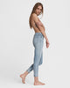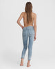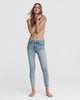 Mid-rise ankle skinny, sits above hip, slim through hip, thigh, and leg