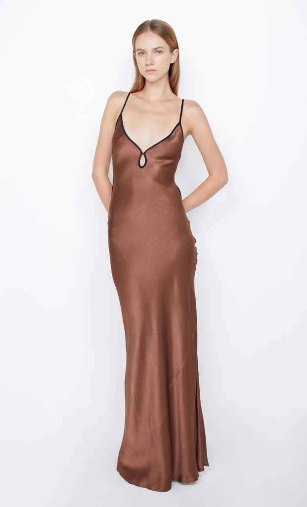 A best selling design, the BEC + BRIDGE Cedar City Maxi Dress is a slinky V-neck style with a keyhole cut-out detail and contrast binding that carries through straps to tie-back. The bias-cut maxi is finished with a rolled hem, and an adjustable knotted strap which can be loosened and tied at desired length. This garment is certified Australian made.