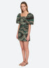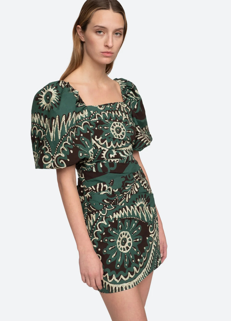 The Charlough graphic print mini dress features short puff sleeves, square neckline and draped detailing.