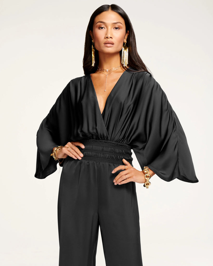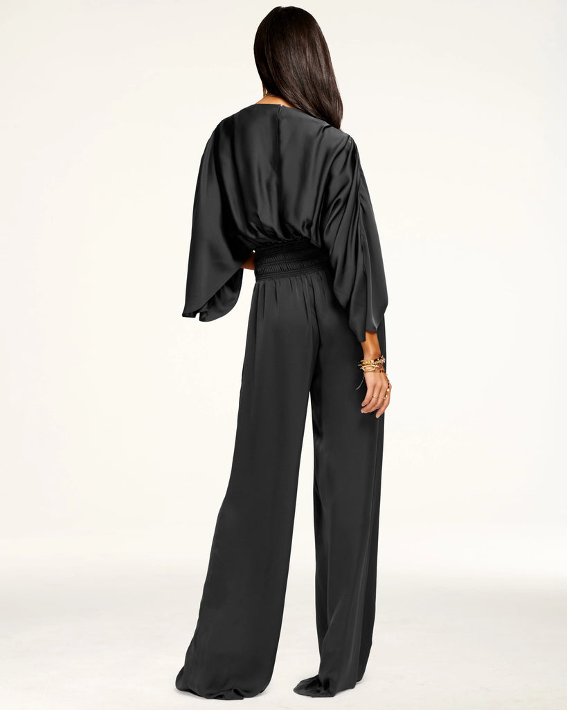 Achieve standout style in seconds with the Cheri, a stunning jumpsuit crafted in our luxe silky satin. Dramatic and elegant, the v-neck bodice is the perfect foundation for the statement sleeves, a striking touch made to optimize movement. Tapered at the center with the shirred waist, the wide leg of this stylish jumpsuit was sure to have you standing tall. Whether worn for a bridal shower or cocktail event, Cheri was made for celebration.
