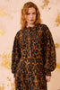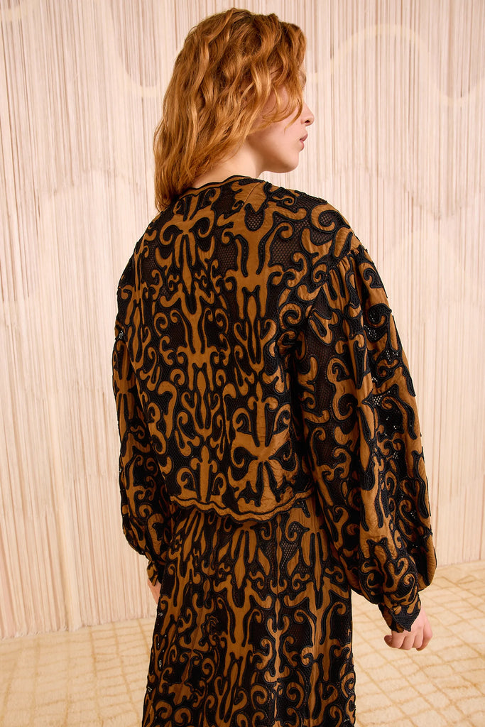 The Coletta Jacket is richly crafted from Victorian-inspired embroidered appliqué, set against a delicate black mesh with intricate taffeta patchwork in deepest saffron. This statement jacket is sculpted with voluminous, blouson sleeves and coordinates with the Gili Skirt for maximum impact, as seen on the AW25 runway in Look 36.