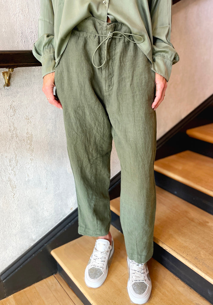 Comfort fit, garment-dyed linen trousers. Zip fly and elastic drawstring on the waist. Welt pockets. Appliqué pockets at the back.