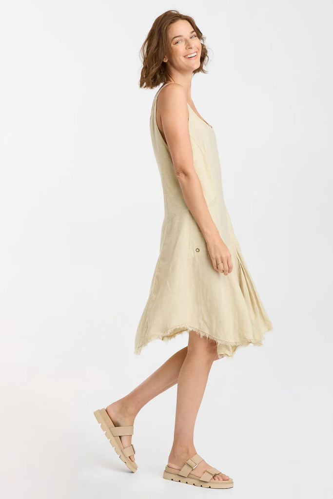 A light linen strappy tank dress with a fun double box pleat detail at front with a sharkbite raw-edge hem. Featuring antique brass hardware and twill tape adroned front pockets.
