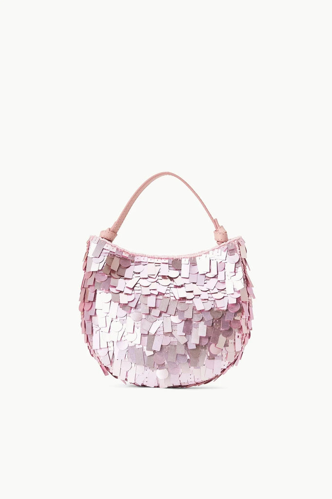 The Crescent Mini Bag is a new evening bag silhouette from our Holiday collection. A mini bag with a knotted leather top handle, the bag is adorned with shiny paillettes to perfectly pair back to any cocktail dress.