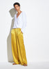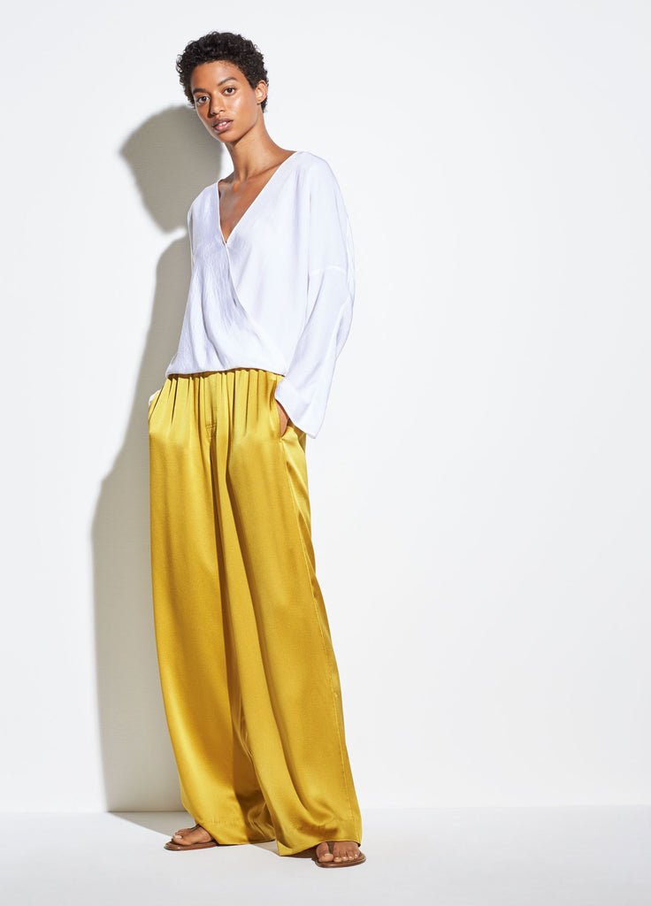 The crossover blouse is done in Japanese satin with a crinkled finish. Try it tucked into the satin PJ pant for a fluid look.