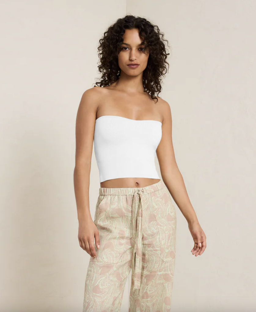 The Dean Top is knitted from soft rayon fabrication in a white shade. This strapless silhouette has a built-in bra, featuring a slight sweetheart neckline and cropped second-skin fit.