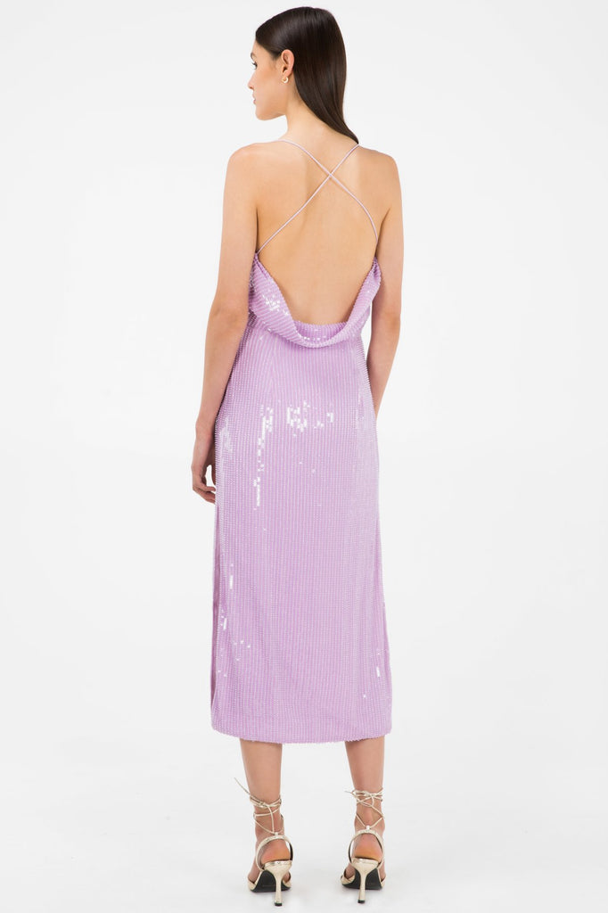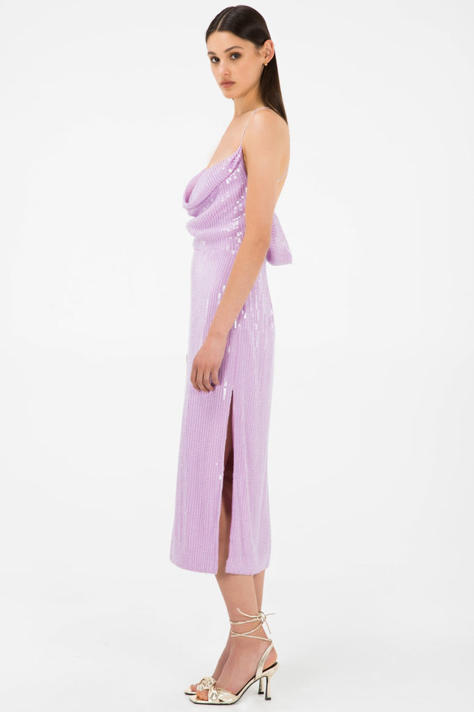 The Devon Dress is crafted from beaded sequins which features a cowl neckline, low cowl back and side splits.