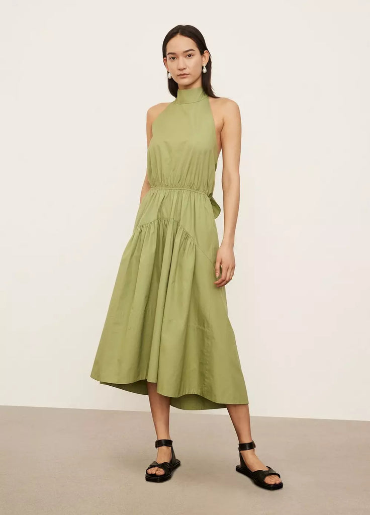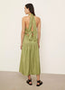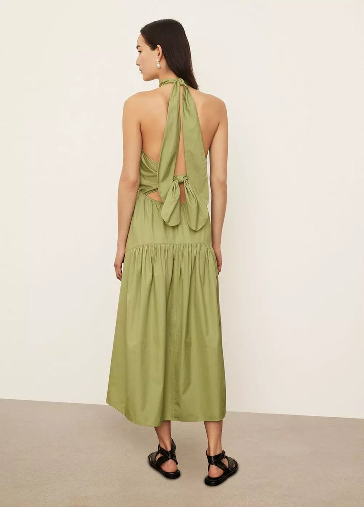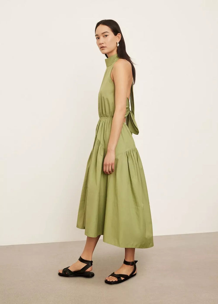 Bold color calls for a bolder shape, here in our easy halter neck dress, secured at the neck with a sash tie, offering an open back before blooming into tiers of a full skirt.