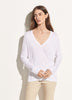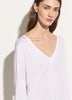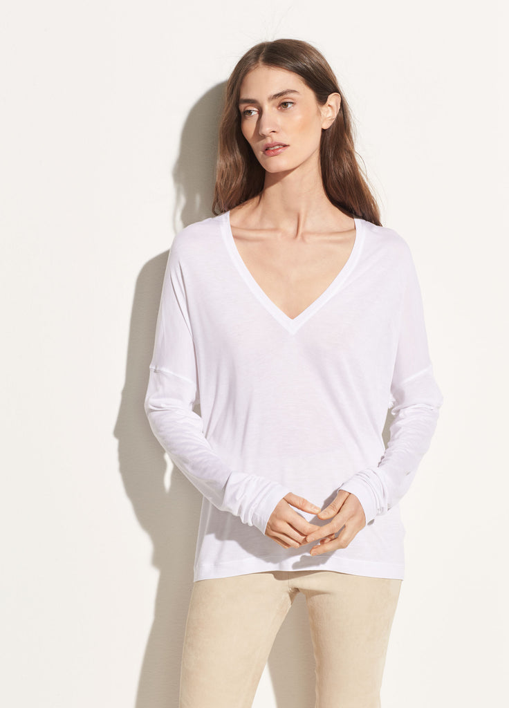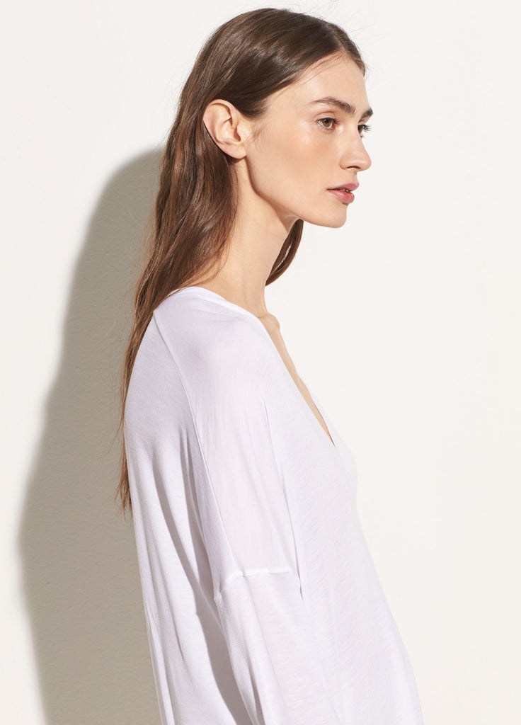 Cut from marled drapey jersey, the drop shoulder V-neck has a warm, lightweight hand and loose, relaxed fit.
