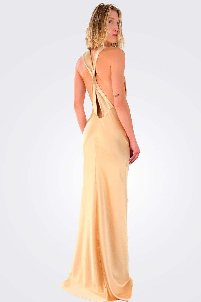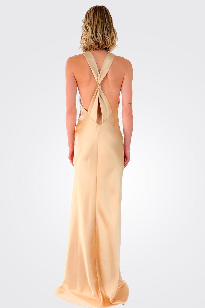 The Eliah Dress by Ronny Kobo is designed in a sleeveless silhouette with an open back.