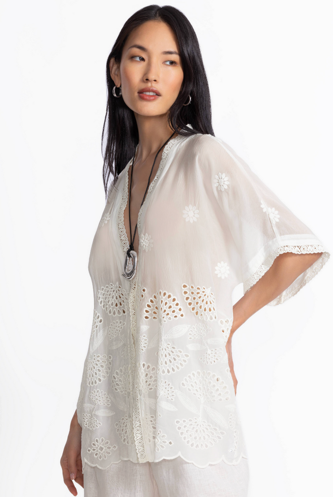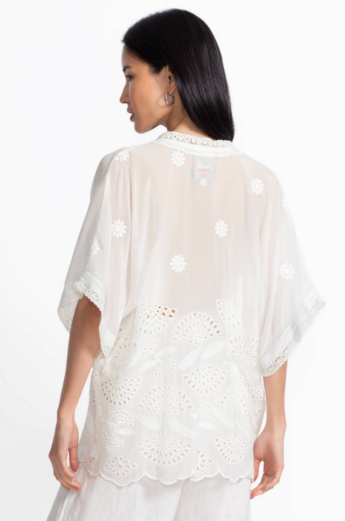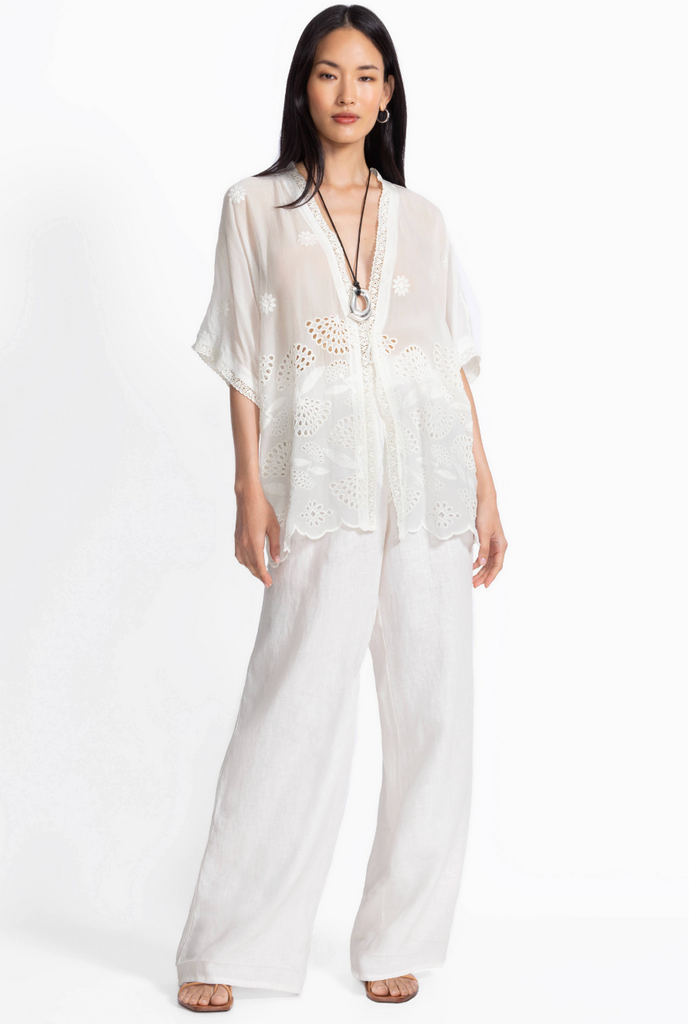 Crafted from a lightweight, breathable fabric, the Elijah Kimono is an easy layering piece perfect for the warmest days. Featuring a single tie closure at the front and relaxed elbow-length sleeves, this flowing kimono is finished with an eye-catching scalloped trim. Layer over a cotton tank and pair with a fitted casual skirt and sandals for a fresh weekend look.