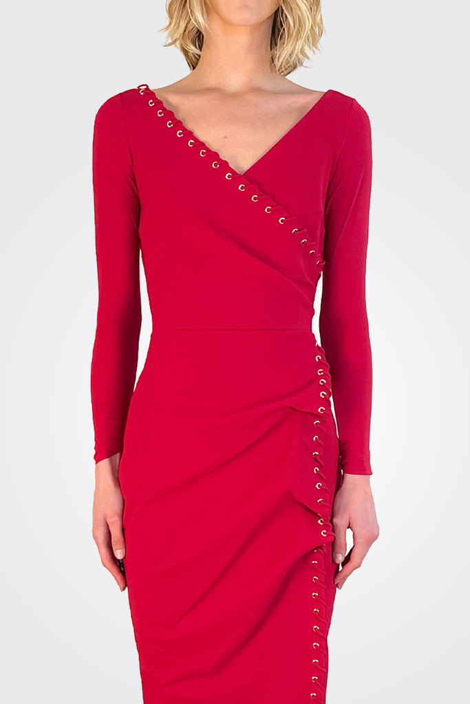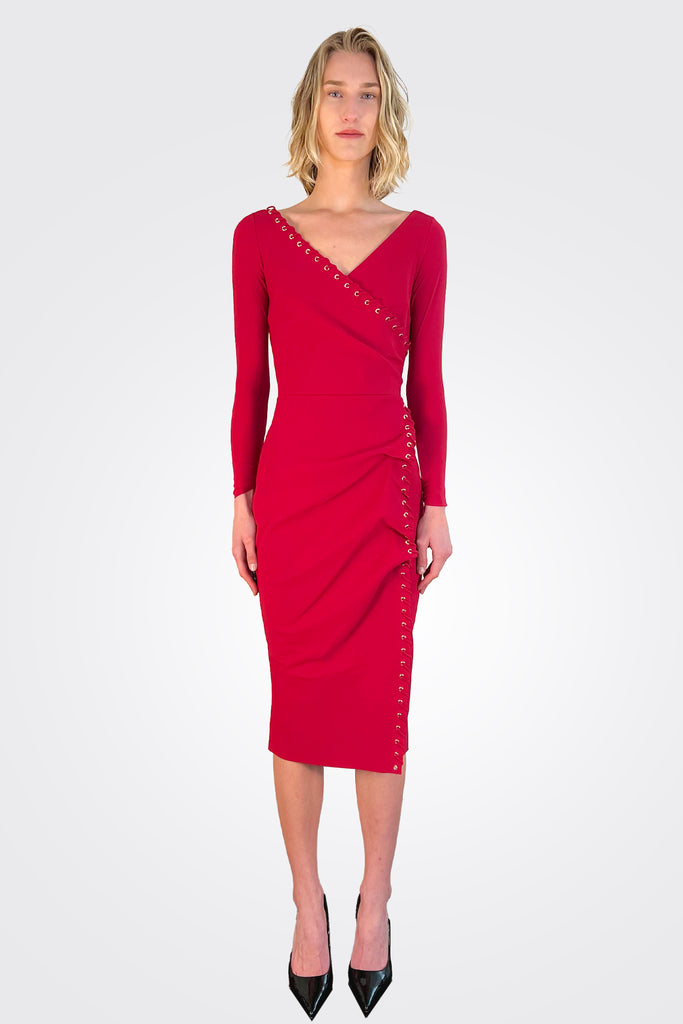 Shiny grommets draw attention to this faux-wrap cocktail dress framed by long sleeves and designed with a raw-edge hem for easy tailoring.
